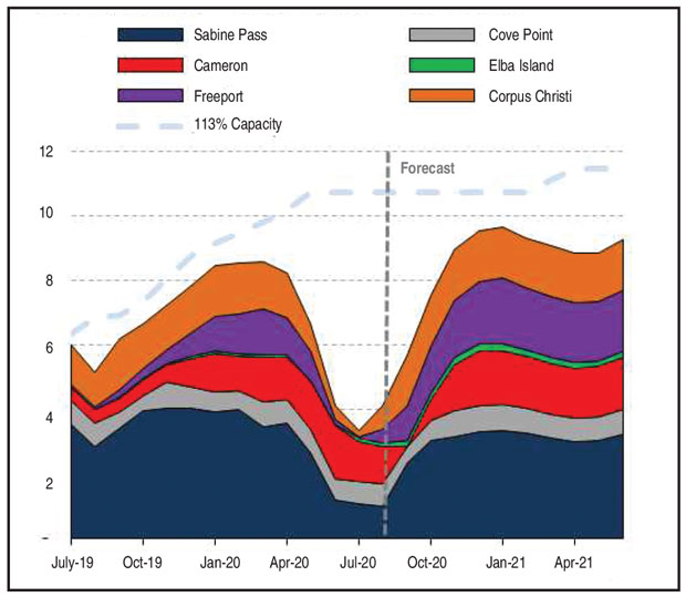 Total exports, including pipeline shipments to Mexico and outbound LNG cargoes, are forecast to climb 1.2 Bcf/d, from 13.6 Bcf/d to 14.8 Bcf/d. Pipeline shipments to Mexico continue to be robust, and the analysis projects an 8% winter-over-winter increase to 5.5 Bcf/d. U.S. LNG exports were running as high as 8.5 Bcf/d late last winter prior to the pandemic, and then slumped to 3.4 Bcf/d last summer. This winter, we see LNG exports averaging 8.7 Bcf/d in the fourth quarter and 9.4 Bcf/d through the first quarter of 2021, pushing to new records as demand from U.S. LNG trading partners in Asia, Europe and other regions increases (Figure 2). LNG offers the promise of a cleaner energy future that is affordable, accessible and can help grow emerging economies around the globe.