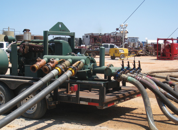 Since most of the water used for completions in the Granite Wash fields is recycled, Newfield uses its own high-density polyethylene (HDPE) pipe to transport water to and from its storage pits (Figure 3). Newfield owns four miles of 12-inch poly, 38 miles of 8-inch poly pipe, and 10 miles of 4-inch poly to move water from pits to the wells being stimulated, from one pit to another, and from the wells back to the recycle pits. Generally, two or three lines are used to pump water from the frac pits to the well being completed.
