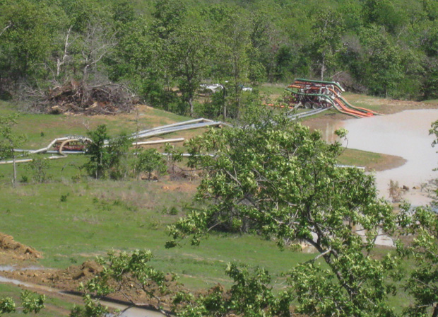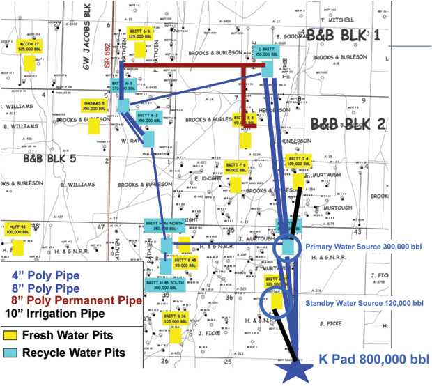 As the horizontal play developed, Newfield built more than 60 freshwater ponds to collect rainwater (Figure 6). The ponds ranged in size from 50,000 to 750,000+ barrels, with a total capacity of more than 8 million barrels. Freshwater was transferred from a pond to a well site through 10-inch aluminum irrigation pipe. In cases where there was not enough freshwater in one pond, multiple ponds were connected using irrigation pipe so water could move from pond to pond. Freshwater has been moved up to 2.5 miles during frac operations.