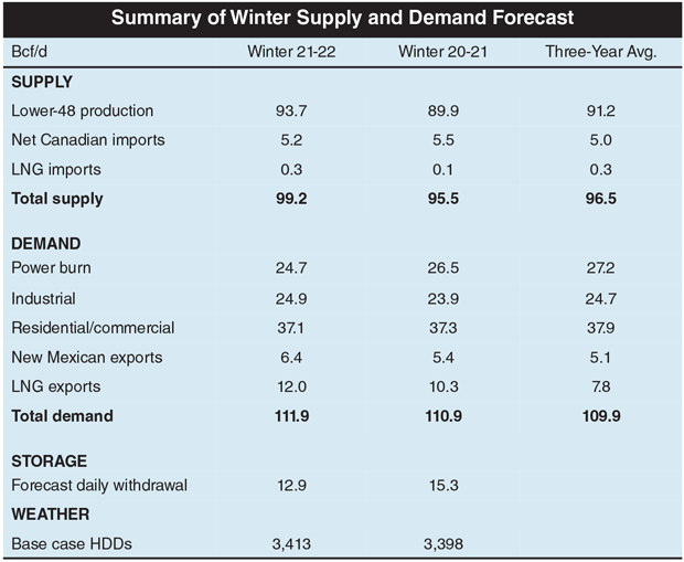 Demand in the residential/commercial sector is forecasted by NGSA to remain the same as last winter based on the National Oceanic & Atmospheric Administration’s forecast for a weather pattern that is quite similar (1% colder) to last winter. Using NOAA’s winter weather forecast as the base case, the end-of-March 2022 storage level is forecast at 1.69 trillion cubic feet, approaching the average of the three-year range. Projected winter 2021-22 withdrawal averages 12.9 Bcf/d, which is 2.5 Bcf/d lower than last year.