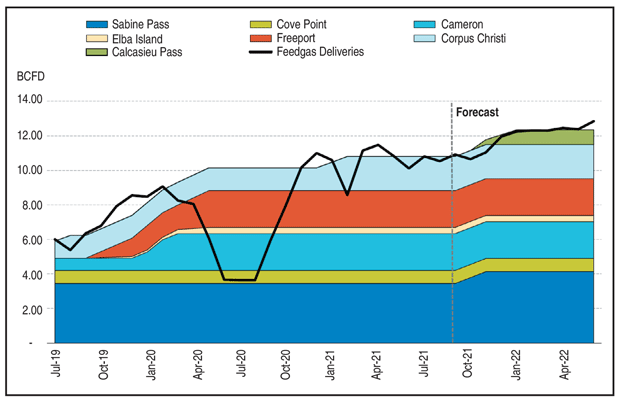 The NGSA Outlook reports that the demand pull from European and Asian markets has kept U.S. LNG exports at record levels, and coincides with new Gulf Coast liquefication capacity entering service. Expanded U.S. LNG exporting capacity and improved Mexican downstream pipeline utilization are expected to continue to result in increased total export volumes, according to the NGSA report. The U.S. Energy Information Administration forecasts that combined exports of LNG and natural gas by pipeline will average 18.3 Bcf/d in 2021 and 19.3 Bcf/d in 2022. Our modeling indicates that LNG exports will reach 12 Bcf/d in January and be sustained at the level through the spring (Figure 1).