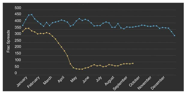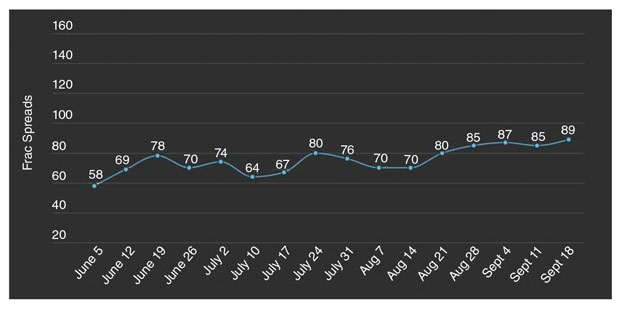 During the week ending Sept. 18, the U.S. market achieved completion activity of 89 spreads after resilience. That was the highest active count since April, when the COVID lockdown measures were put in place, but the road to 100 is a long one at the current strip and demand profile. In order to get back to 150 spreads, there will need to be a marked shift in realized prices in 2021 that allows producers to finance more activity. The other key unknown will be on the political front, with a presidential election around the corner and a murky Democratic energy backdrop as it relates to fracturing and shale activity. Until some of these policies and events are clarified, operators will be hesitant to deploy additional capital across basins beyond maintenance mode.