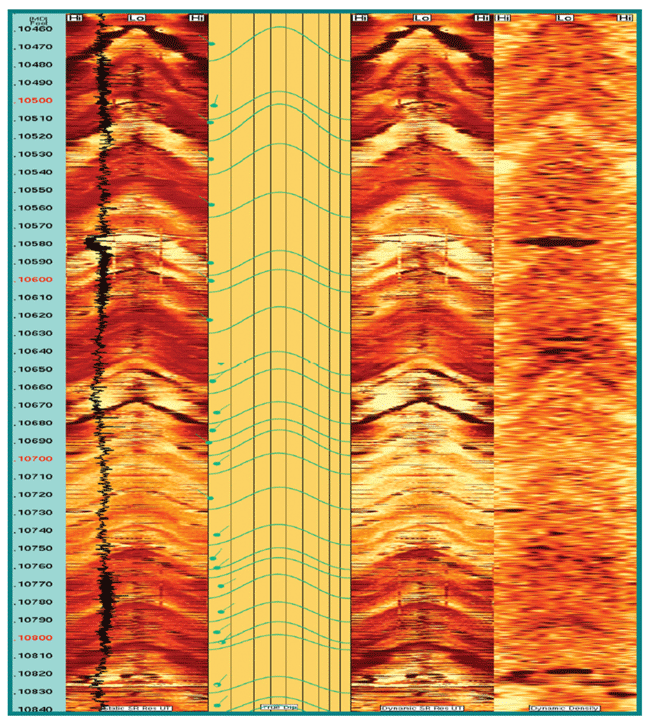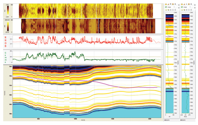 Figure 1 shows the correlation of the horizontal well. The top two tracks display the images acquired using logging-while-drilling tools, with the first track illustrating the density and the second track illustrating the laterolog resistivity. Because this is a horizontal well, the images convey the bottom of the well in the center of the image.
