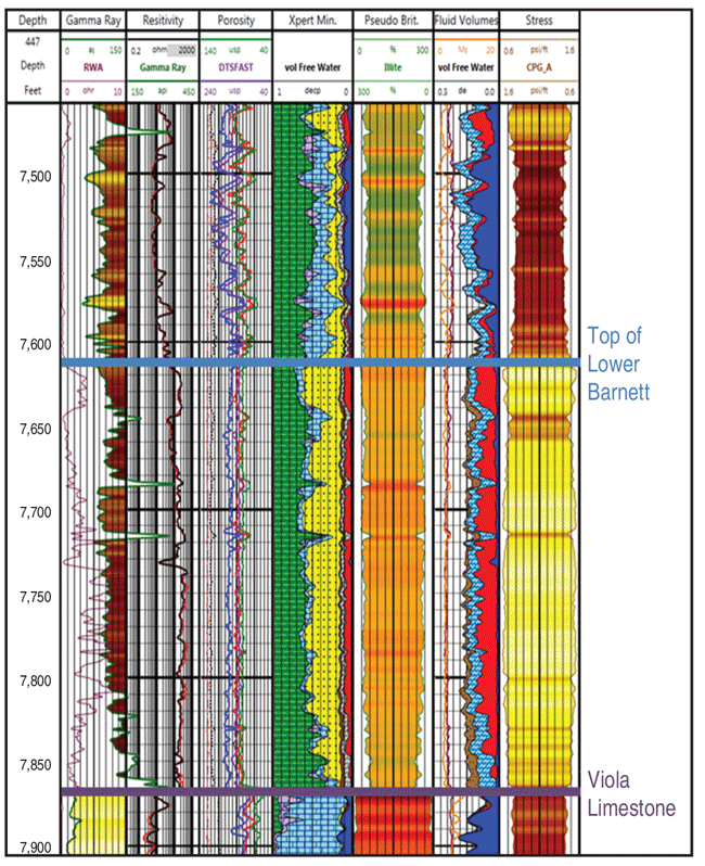 OKLAHOMA CITY–Horizontal completions within a complex oil condensate window of the Barnett Shale have proven challenging because of problematic well placement within an optimum reservoir section, and because of the vertical and mechanical proximity to mobile water in the Viola Limestone. Accurate formation properties along the horizontal well are required to identify both conditions.