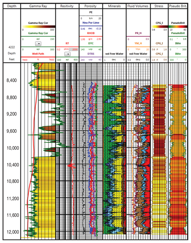 Track 1 in Figure 3 is depth, track 2 represents the gamma and apparent water resistivity from the offset well, and track 3 illustrates resistivity. Track 4 details the density, neutron, and sonic data acquired using wireline tools. Track 5 shows the petrophysical evaluation of mineralogy and fluid volumes, and track 6 represents the brittleness calculated from Poisson’s ratio and Young’s modulus, taken from the sonic and density data. Track 7 also provides information on the fluid volumes taken from track 5, including Young’s modulus and Poisson’s ratio. Finally, the closure pressure gradient profile is represented in track 8.