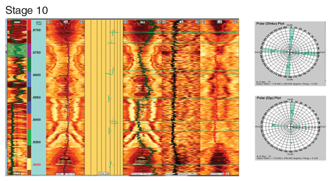 Fractures were identified and quantified along the horizontal wellbore. An example from stage 10 of the borehole imaging software is illustrated in Figure 6.