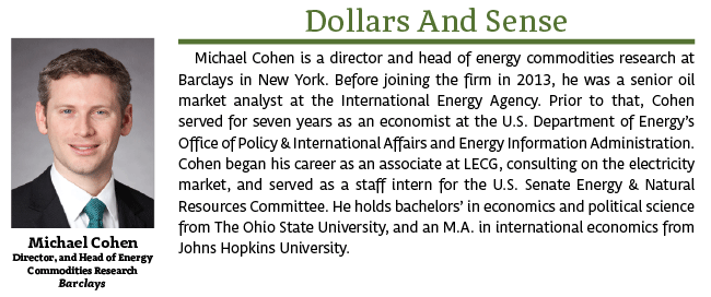COHEN: After analyzing the break-evens in the shale plays, we do not see a $40-$45 price as adequate to sustain continued growth in shale production for the medium term. With shale supply flat or in decline, the growth from other supply sources will be insufficient to fill the void created by production declines and incremental demand growth.
