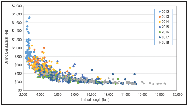 Consistent use of best practices and systematic equipment upgrades has led to improved performance year after year in Range’s Marcellus operations, with wells progressively drilled in less time and at a lower cost. The focus has been on the key performance indicator of cost per lateral foot. One of the keys to successfully implementing extended-lateral drilling was drilling longer horizontals while continuing to achieve the goals of safe, environmentally compliant, sustainable and cost-efficient Marcellus development over time, including maintaining the KPI trend shown in Figure 3.