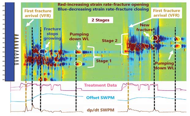 The first stage is shown on the lower left of Figure 1. The first fracture arrival occurred early in the stage. It is identified on the strain-rate plot by a tensile region (red) located between two compressive regions (blue). At the same time the strain recorded a fracture intersection, the SWPM data shows a pressure inflection amplified on the derivative plot. The timing of the “volume to first response” (VFR) for each stage is noted by dashed gold lines for both stages. Simply stated, VFR is the volume of fluid pumped into the treatment well when the fracture intersection occurs at the monitor well. It is a qualitative measure of cluster efficiency, or fluid distribution uniformity within a stage.