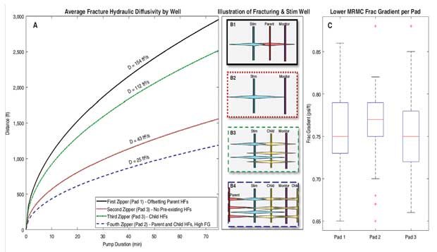Fracture diffusivity in the 12 infill wells was broken into four categories. As seen in Figures 3A, 3B1 and 3B2, the first two categories are from an infill well next to a parent well that saw rapid pressure responses (average D = 154 square feet per second) and a well with no pre-existing fractures that saw slower pressure responses (average D = 43 feet2/s).