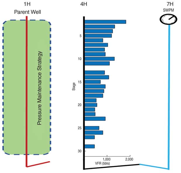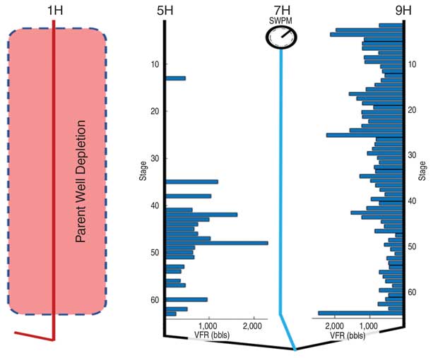 The bar chart on the 5H and 9H represents the VFRs measured using SWPM recorded in the 7H. Each bar represents the volume pumped into the treatment well when the 7H sealed wellbore recorded a pressure response. Longer bars equate with more fluid pumped into the treatment well before the response was recorded on the 7H. The key take-away from the image is the 5H failed to generate fractures that contacted the 7H for the first 60% of the lateral, while the 9H generated a response for every stage completed.