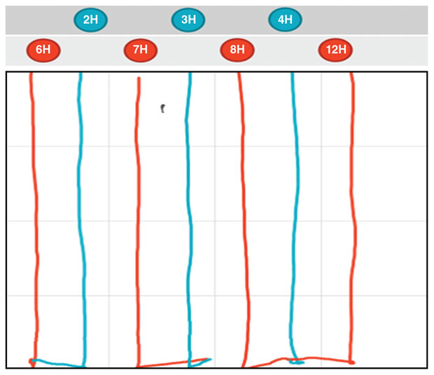 SWPM provides a powerful diagnostic to quickly determine VFR during offset well completion. A higher VFR suggests more uniform fluid distribution, which creates more similar fracture geometries and improves drainage efficiency within the stimulated rock volume. A lower VFR indicates poor fluid distribution within a stage, which can lead to dominant fractures with excessive geometries, increasing the potential risk of “short-circuiting” well spacing and excessive well communication. Several factors can affect VFR, including rock mechanical property heterogeneities, geologic structure, faults, natural fractures, unequal perforation diameters, an insufficient pressure drop across perforations, poor cement isolation and a faulty frac plug.