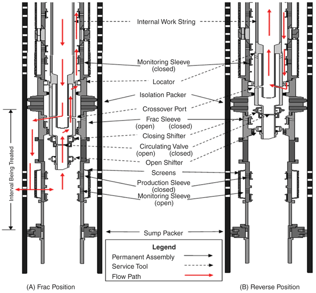 Figure 1 shows the tool positions for both frac and reverse operations. In the frac position, the monitoring sleeve and the frac sleeve are both opened while the production sleeves remain closed. Weight is applied on the locator to keep the tool in position. Proppant-laden frac fluid is pumped down the work string, through the crossover port and frac sleeve, around the screens, and into the reservoir. There is a path that allows pressure to communicate through the monitoring sleeve and the circulating valve and into the annulus to be monitored at the surface.