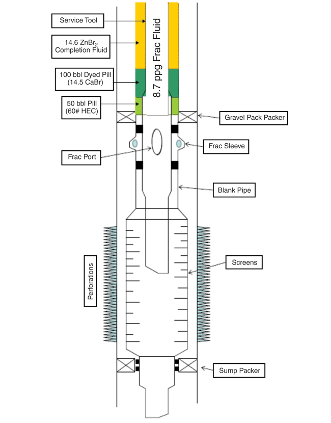 - To ensure that the zinc-bromide (ZnBr2) completion fluid would not be discharged overboard when reversing out after the frac jobs, a nonzinc spacer fluid followed by a viscosified spacer fluid is pumped ahead of the pad fluid. These spacers are placed in the annulus above the downhole equipment before the service tool is placed in the frac position (Figure 3). The viscosified spacer aids in reversing out the remaining proppant after the end of each frac job. Furthermore, the non-zinc spacer is dyed to help visually identify when the spacer is reversed out before flow is diverted to the shakers to capture the ZnBr2 completion fluid.
