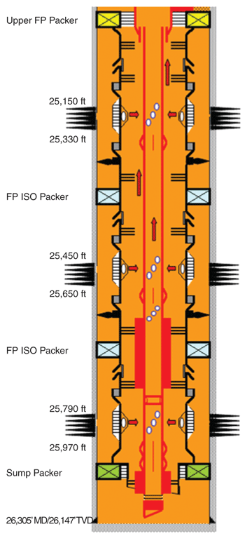 As with any project of this magnitude, significant planning went into designing the completions at Cascade/Chinook. When the decision was made to use the STMZ system, there were a number of system components that needed to be upgraded and qualified for the pressures, pump rates, and depths that would be encountered. The completion team worked closely with the supplier to make the necessary modifications and qualify the STMZ equipment prior to deployment. As a contingency, a conventional stacked frac pack system was prepared.