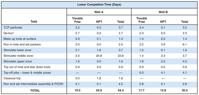 Table 2 shows the STMZ portion of the completions by major activity for both wells A and B, beginning with the tubing-conveyed perforating operation and continuing through setting the intermediate assembly. The times are broken into trouble-free, nonproductive time (NPT), and total time.