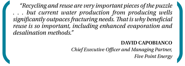 “In terms of beneficial reuse, recycling and reuse are very important pieces to the puzzle,” says David Capobianco, chief executive officer and managing partner at Five Point. “Diamondback has indicated it seeks to use 65% recycled water and Devon Energy has said it targets 50% recycled water for fracturing operations. Other operators have set goals as well to reduce freshwater usage. But current water production from producing wells significantly outpaces fracturing needs. That is why beneficial reuse is so important, including enhanced evaporation and desalination methods.”