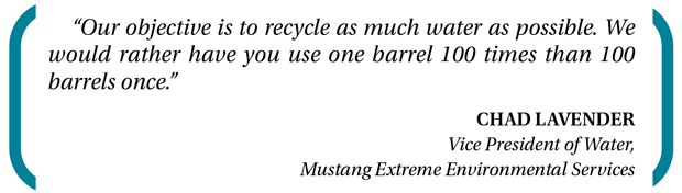 Chad Lavender, vice president of water at Mustang Extreme Environmental Services, says satisfying the water demand for fracturing in the Permian comes down to a few simple questions. “What water is available and in what volumes, what is in it, and what is it going to be used for? We do not try to find a magic box because there is a huge difference in each shale play, and even from well to well,” he comments.