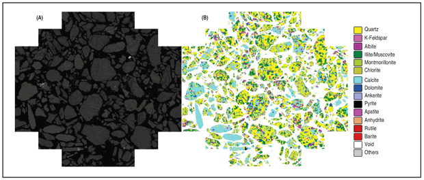The approach takes advantage of SEM-based mineralogical analytical tools, which combine the imaging capability of an SEM with energy dispersive spectrometry (EDS) to provide both textural and elemental data. The value of using SEM-EDS over traditional techniques, such as X-ray diffraction (XRD) and X-ray fluorescence (XRF), is that the original rock texture of each cuttings particle is retained and collected. Figure 1(A) shows an example of an output grey-scale photomicrograph generated by the SEM, while Figure 1(B) shows the equivalent mineral map with each color representing a different mineral species detected by EDS analysis of the same area.