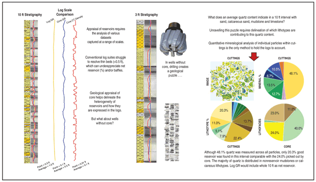 Figure 2 shows the resolution at which the reservoir can be appraised, and the pitfalls of thin-bedded reservoirs. The benefit of characterizing cuttings data as lithotype proportions as opposed to mineral volumes is that a direct comparison can be made with the lithofacies assigned in the core interval to delineate net reservoir.