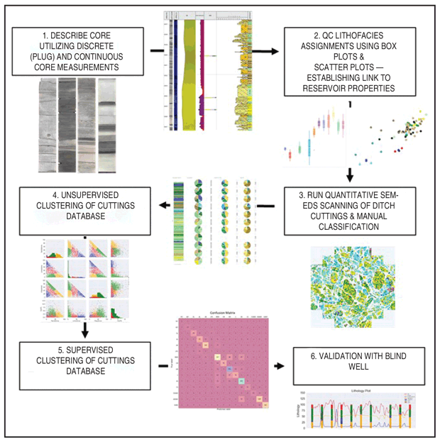 Quantitative analysis of cuttings, the closest thing you can get to core, can provide a solution. The core-to-cuttings lithotype calibration workflow is shown in Figure 3, where core lithotypes are used as seed testing for cuttings lithotypes classification. A lithotype model is created by training a machine learning algorithm to automatically assign lithotypes to cuttings based on similarity to the training set. The benefit of this technique is that consistent lithotyping can then be conducted on adjacent wells, which do not have conventional core, and where formation characterization otherwise would have been purely reliant on petrophysical log interpretation.