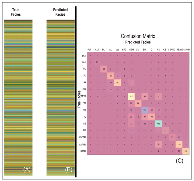 Comparison of True Facies (A) versus Predicted Facies (B) and Confusion Matrix (C) Between the Datasets