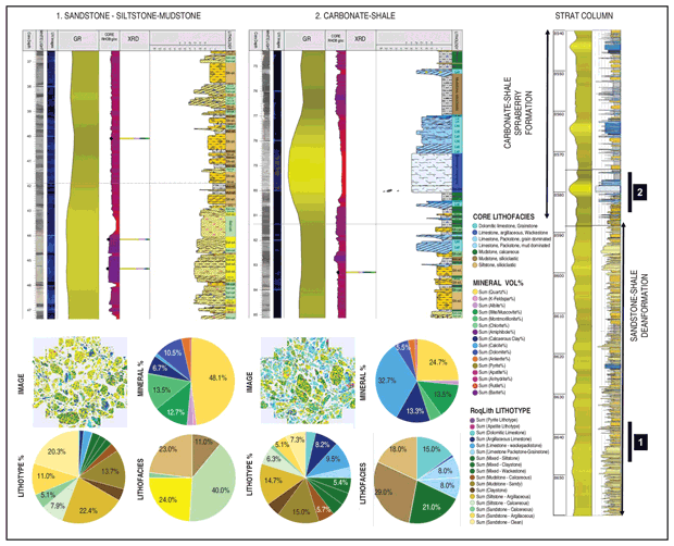 For the purposes of the study, 13 main lithofacies were defined using mineralogy criteria belonging to carbonate-, clay- and siliciclastic-dominated groups. Petrographic control points (mineralogy) were used as inputs for descriptive statistics to determine the range of key mineral values and total organic carbon content within lithofacies.