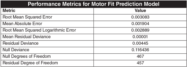 The validation data indicates that the ML model used for predicting bearing fits performs very well, with low values for the root mean squared error, mean absolute error and root mean squared logarithmic error. The residual deviance and the null deviance values suggest that the model explains an overwhelming portion of the variance in the data. Table 1 presents the values for these metrics and a few others.