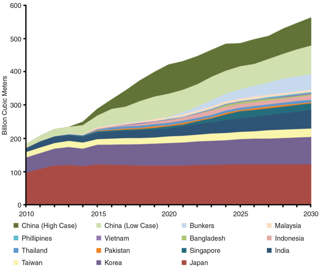 That said, however, long-term LNG demand is expected to rise at an annual rate of 5 percent or more, with most of the growth coming in Asia (Figure 2). In time, it is likely that growing demand will absorb all the new liquefaction export capacity coming on line over the next five years, and could lead to the development of additional North American projects (including some on the U.S. West Coast and in British Columbia).
