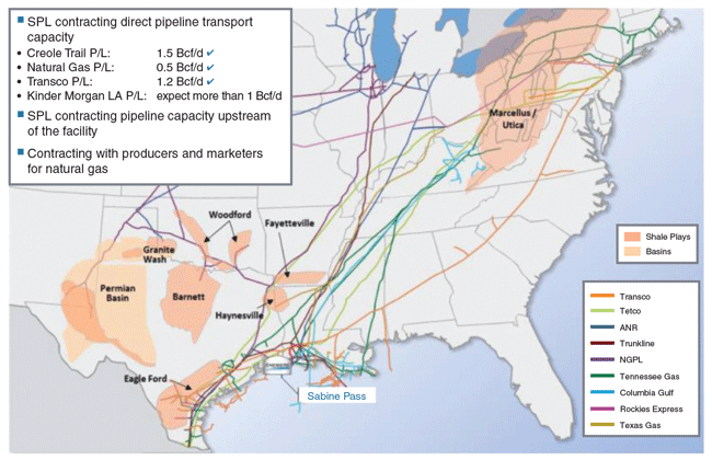 Cheniere has identified several key upstream pipeline expansion projects that will enable delivery of most of the gas needed at Sabine Pass. They include Texas Gas Transmission (owned by Boardwalk Pipeline Partners), whose Ohio-Louisiana Access Project (OLAP) will add bi-directionality to the 690-mile section of the Texas Gas pipeline between southwestern Ohio (Lebanon) and southern Louisiana (CTPL Gillis at the northern end of the existing Creole Trail Pipeline), thereby allowing Marcellus and Utica gas to flow south.