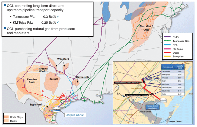 The 48-inch Corpus Christi pipeline (CCPL) will have the capacity to move up to 2.25 Bcf/d, and a parallel 42-inch-diameter, 1.5 Bcf/d pipeline is planned to supply the fourth and fifth trains. The CCPL will tie the facility into: