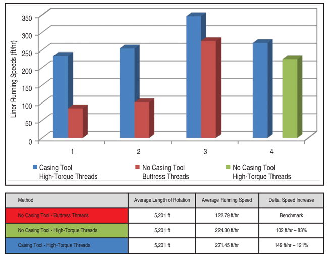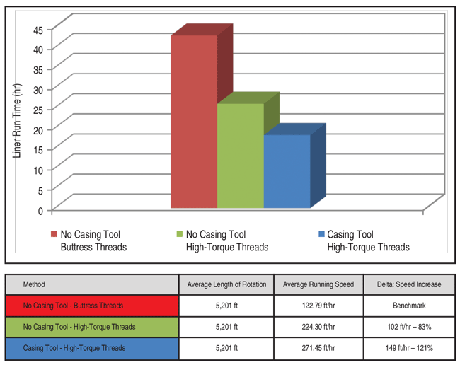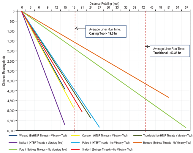 The data show up to a 121 percent average increase in running speed while rotating the liner in the hole using the vibratory casing tool, resulting in as much as an average 55 percent decrease in rig time compared with offset wells (Table 1). Importantly, less torque at higher rotary speeds also was seen on the wells using the vibratory tool.