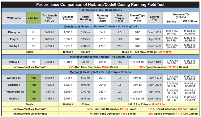 Four wells did not use a vibratory casing tool. Casing was run in three wells (Biscayne, Fury 1 and Shelby 1) using buttress threads without a vibratory tool, and in one well (Polara 1) it was run using high-torque semi-flush (SF) threads without a vibratory casing tool. Casing in the other four wells (Worland 1B, Camaro 1, Thunderbird 1A and Malibu 1) utilized high-torque SF threads and vibratory casing tools. A performance comparison of the three methods of running casing illustrates that the four wells in which casing was run with vibratory tools consistently outperformed the four offsets wells that did not use a vibratory tool.