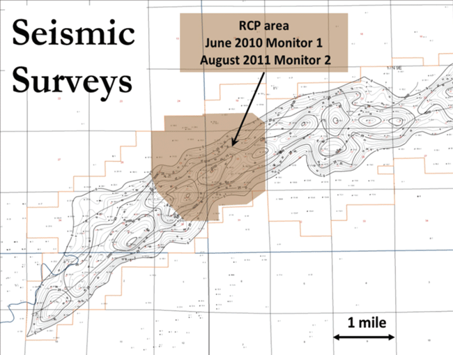 Figure 1 shows the location of the reservoir characterization project (RCP) area, which is the area where base line (2008), monitor 1 (2010) and monitor 2 (2011) seismic surveys were shot. The RCP area covers 4.0-4.5 square miles, which is about one quarter of the entire Delhi Field. The estimated original oil in place of the RCP area is 100 million barrels, and 57 million barrels have been produced for a 57 percent recovery factor.