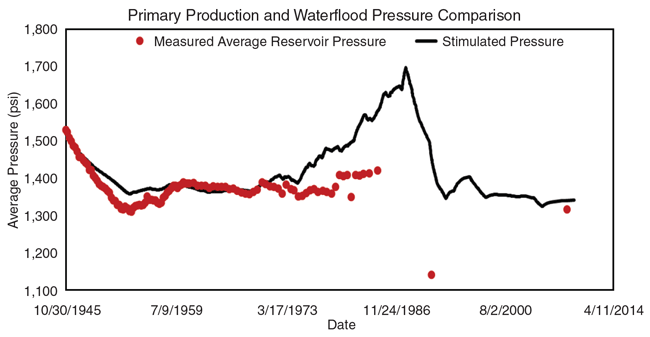 The simulated reservoir pressures were compared with the measured reservoir pressure at 3,135 feet datum. The pressure match focused on the primary production phase (before 1953) and the production periods after 1991. Figure 3 shows the pressure match in the RCP area. It is noteworthy that the reservoir pressure dropped to 1,100 psi in 1991 in the absence of notable water injection, and increased to 1,300 psi in 2009 with water injection support.