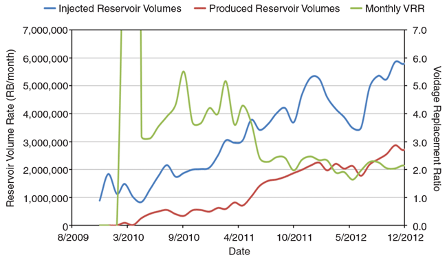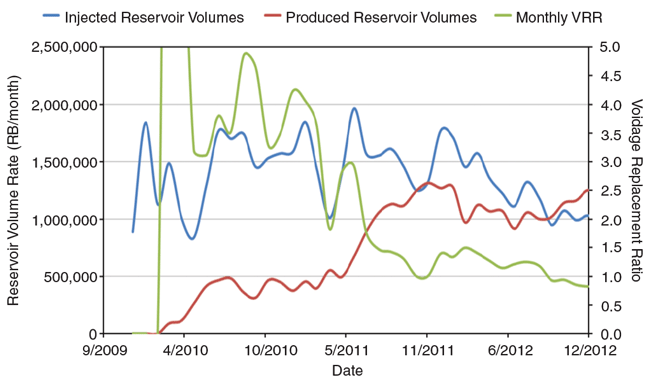 As shown in Figure 4A, the VRR is above one, indicating that the injected volume is greater than the produced volume, which results in increased reservoir pressure. A VRR of one will indicate a net balance of injection and production fluids, and no change in reservoir pressure. When VRR is less than one, reservoir pressure decreases.