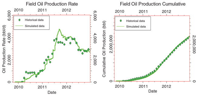 Rate control was the boundary condition applied at the producers. Figure 5 shows the results for oil production in the RCP area. The simulated field oil production rate (solid line on the left figure) and field cumulative oil production (solid line on the right figure) show excellent agreement with the historical data. However, there is a definite difference in gas production (90+ percent CO2) starting in early 2012.