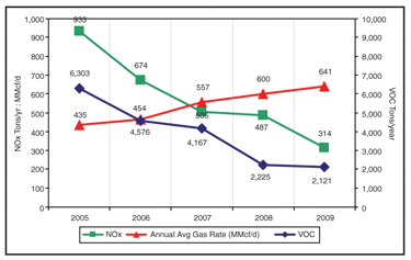 The most significant benefit to substituting natural gas for conventional diesel is the impact on our environmental footprint. Not only are we seeing improvements to regional air quality, but a significant reduction in carbon dioxide, volatile organic compounds and nitrogen oxide emissions (Figure 1). An Encana rig tested in the Jonah Field in Wyoming over four years showed a reduction of more than 4,000 tons of VOC and 600 tons of NOx emissions per year, even with increased drilling activity. Additionally, natural gas engines run quieter than their diesel counterparts, are less visually polluting and are odorless.