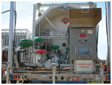 LNG, liquefied through refrigeration (-260 degrees Fahrenheit), is stored as liquid in insulated vessels and transported to the site. The LNG is vaporized on site with a LNG fuel handling system and is delivered to the engine in a gas state at approximately 60 degrees F. This unique application of technology, initially tested by Encana in the Haynesville Shale for five months and representing the first such test of its kind, has been successful and is now being implemented elsewhere.