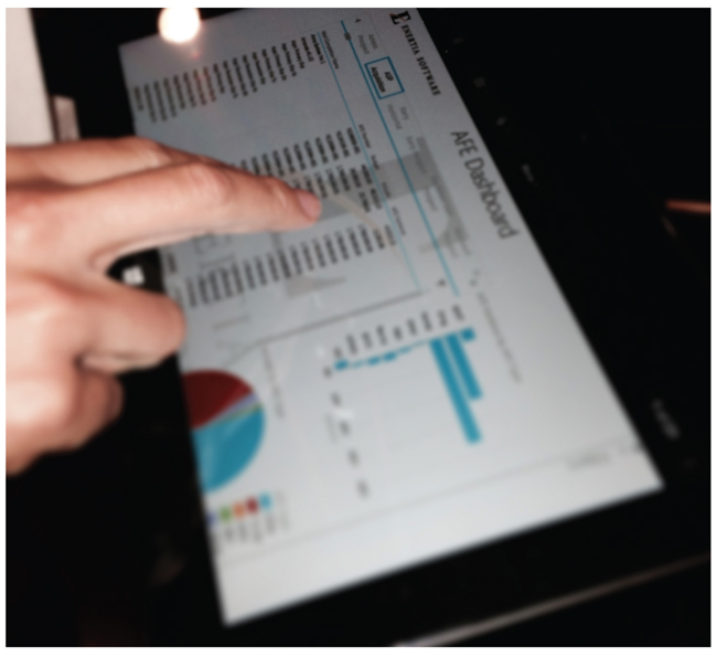 At company headquarters, a committee meets to review the latest authorization for expenditure. After discussion and a few budget adjustments, agreement is reached. Each team member signs off on the AFE using whatever device–tablet or phone–he brought to the room.