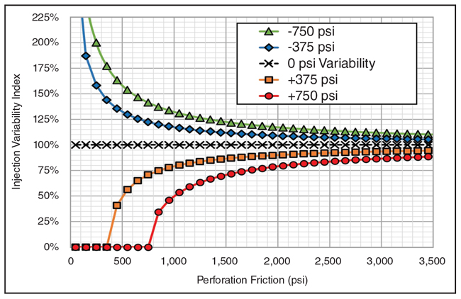 Figure 1 shows the injection variability index, or the ratio of the base line injection rate with zero fracture pressure variability between clusters to the injection rate associated with changes in perforation friction at other intrastage frac initiation points. A variation in fracture-entry pressure is communicated directly as an equal pressure change across the perforations, since the pressure is constant inside the wellbore across all clusters within a stage. The injection rate either will increase or decrease at each cluster proportionally related to perforation friction. This figure demonstrates the benefit of applying an XLE perforating strategy, with perforations of varying fracture-entry pressures converging toward fluid distribution parity by increasing perforation friction.