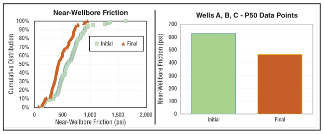 Lateral drilling data were acquired to determine the minimum horizontal stress variability along the lateral, and three Middle Bakken wells were selected to have full sets of pre- and post-proppant step-down tests (SDTs) to quantify near-wellbore friction, number of open perforations and perforation friction. Figure 2 shows initial and final near-wellbore friction from the SDTs for all applicable stages in case study wells A, B and C. Data are shown as a cumulative distribution function and the P50 values for the initial and final SDTs are shown in the figure’s bar chart at right.