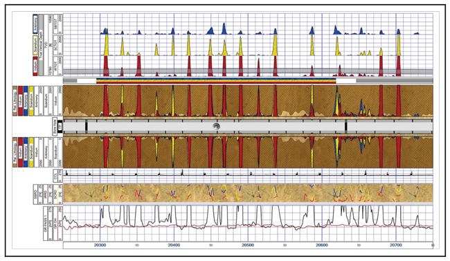 The production log analysis in Figure 5 is for Stage 10 in the same Middle Bakken well shown in Figure 4. The two-well average for producing cluster efficiency was 80 percent for the 20 stages logged and analyzed. The data indicate that 14 of 15 clusters were producing in this stage for a single stage producing PCE of 93 percent.