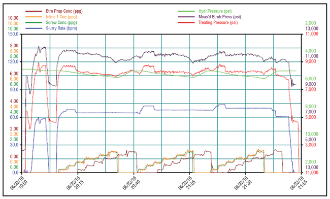 The initial perforation friction for Stage 3 was 2,200 psi, and the final perforating friction was 1,400 psi. The 800-psi drop in perforating friction may be attributable to eroding perforation diameters, but is more likely from the leaking plug exposing clusters from the stage below.