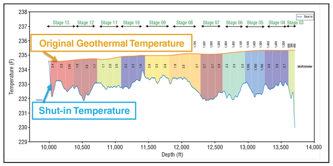 Production log analysis was performed after the shut-in period required for the warm-back, and a DAS ranking system was implemented as a constraint into the temperature model to converge on a more probable solution, mitigating uncertainty in interpreting DTS results in a horizontal wellbore. Higher-frequency noise was aggregated over time, creating a qualitative production allocation for each cluster. DAS obtained with DTS provides a unique description of the wellbore flow profile.