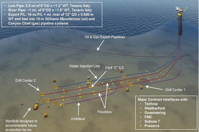 Two eight-inch subsea production flowlines and one eight-inch water injection line tie to the FPS. The export system from the FPS consists of two 12-inch oil and natural gas lines that span 16 miles before connecting to the 18-inch Williams Mountaineer (oil) and Canyon Chief (gas) pipeline systems for transport to a Chevron-operated shore terminal at Empire, La.