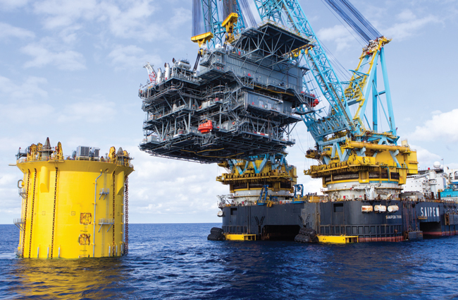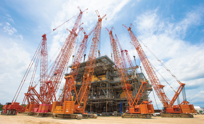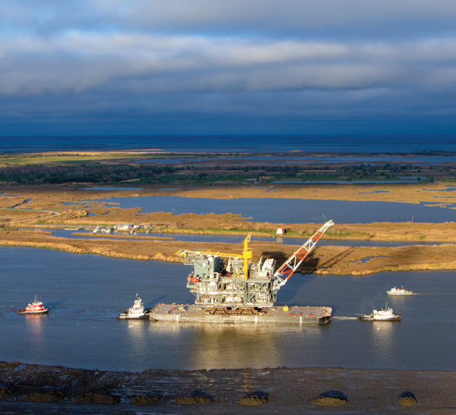 The topsides for the Gulfstar One FPS for the Tubular Bells Field were designed to process 60,000 barrels of oil and 135 MMcf of gas a day along with up to 60,000 bbl/d of water injection. Shown here is the main deck lift in May 2013 at Gulf Island Marine Fabricators’ construction yard in Houma, La.