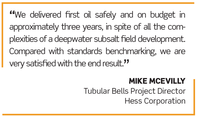 “This is the most rewarding deepwater project I have been associated with,” says Mike McEvilly, an industry veteran of 34 years who served as project director of the Hess Corporation-operated Tubular Bells. “The success of the project on such a short development timeline is the result of a balanced combination of teamwork, execution efficiencies, technical expertise, budget discipline, and adherence to safety.”