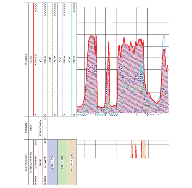 Figure 2 illustrates how the hydrocarbon chain ratios change during drilling in a section of a lateral. In this case, methane dominates the gas flow in first and second gas shows, but the gas composition changes in the third gas show, indicating a change in either organic carbon content (on which heavier gases can adsorb) or a higher-permeability streak, perhaps a natural fracture.
