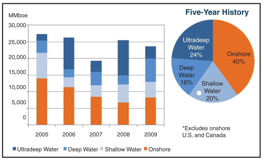 During 2010, ultradeepwater discoveries were even more prominent, accounting for almost half of the 28.3 billion barrels of oil equivalent reserves discovered outside of onshore North America.